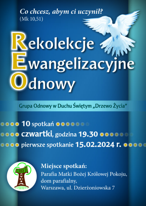 Grupa Odnowy w Duchu Świętym „Drzewo Życia” organizuje w parafii Matki Bożej Królowej Pokoju Rekolekcje Ewangelizacyjne Odnowy. Jest to cykl 10 spotkań pozwalających na nowo zobaczyć działanie Boga w naszym życiu i pogłębić życie wiary.